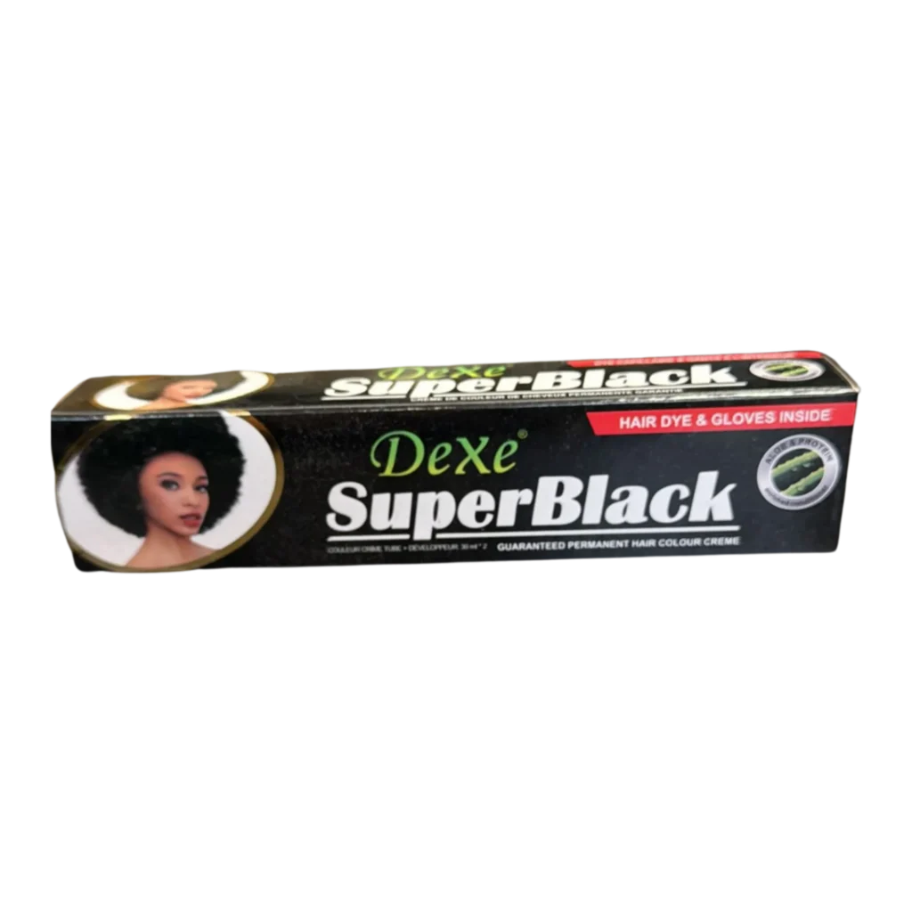 The Dexe Super Black Permanent Hair Colour Creme offers a guaranteed vibrant, long-lasting black shade. The easy-to-use kit includes a developer and hair dye tube, along with protective gloves. Its formula is enriched with protein to protect and repair hair during the coloring process.