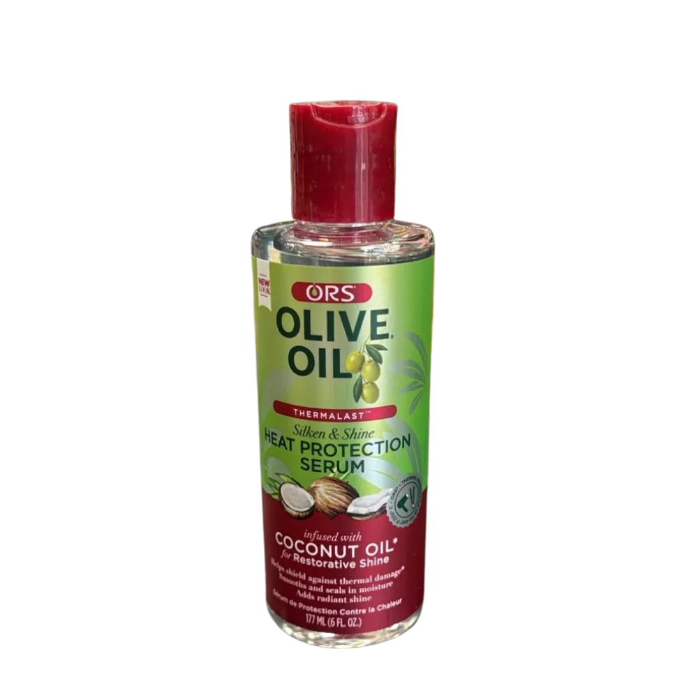 Heat protection serum infused with olive and coconut oil to shield hair from thermal damage while adding shine and smoothness.