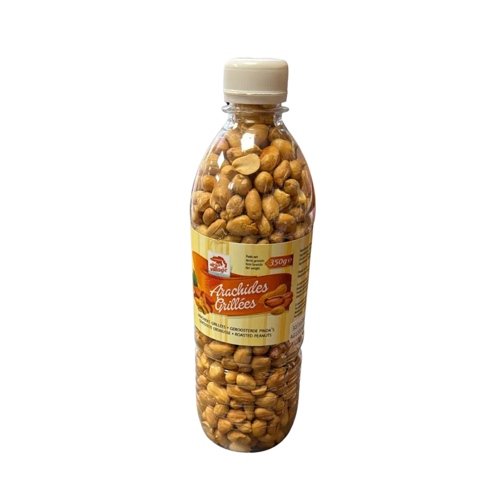 Afro Village Arachides Grillées (Roasted Peanuts) in a convenient 350g bottle. These perfectly dry-roasted peanuts are a beloved West African snack, offering a satisfying crunch and deep nutty flavor. Ideal for snacking, topping salads, or grinding fresh for a homemade paste.