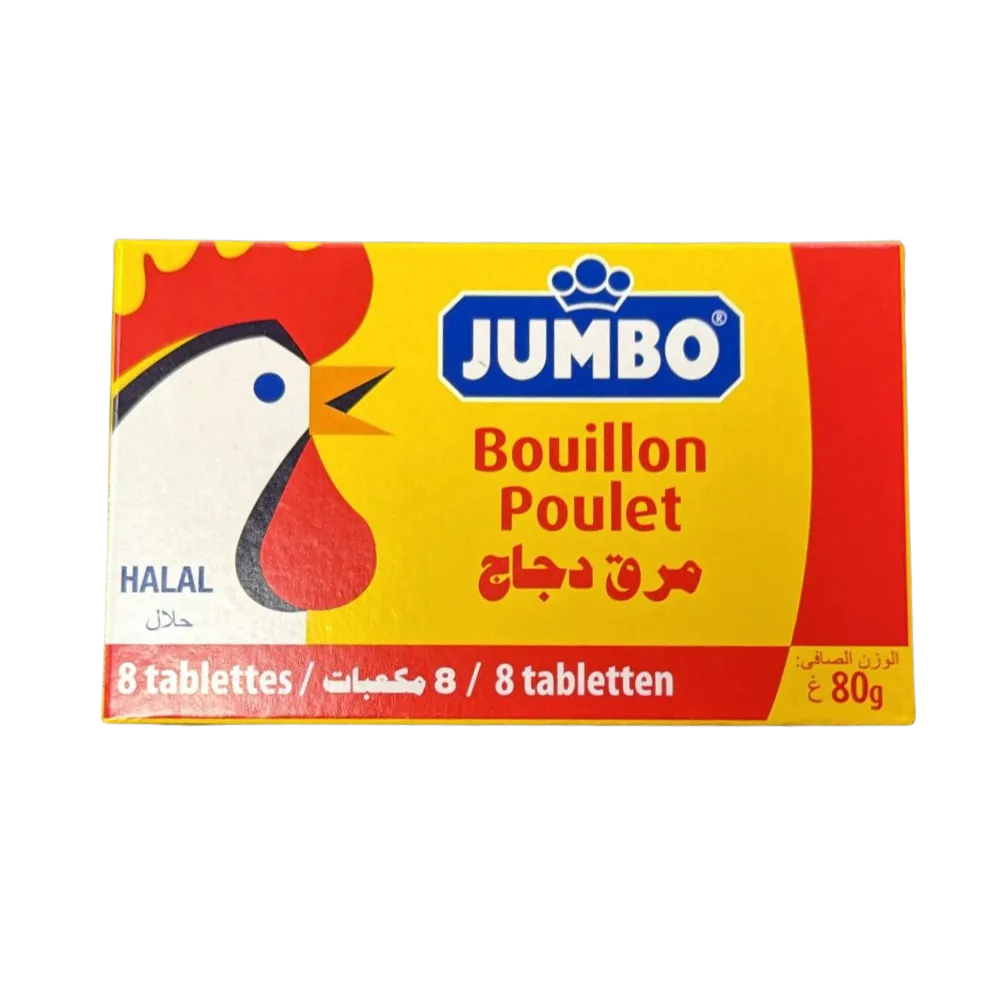 JUMBO Authentic Halal Chicken Bouillon Cubes provide rich, concentrated chicken flavor, perfect for enhancing your African, Middle Eastern, or international dishes. Each 80g pack contains 8 tablets, ideal for adding depth to rice, soups, stews, and sauces. Certified Halal.