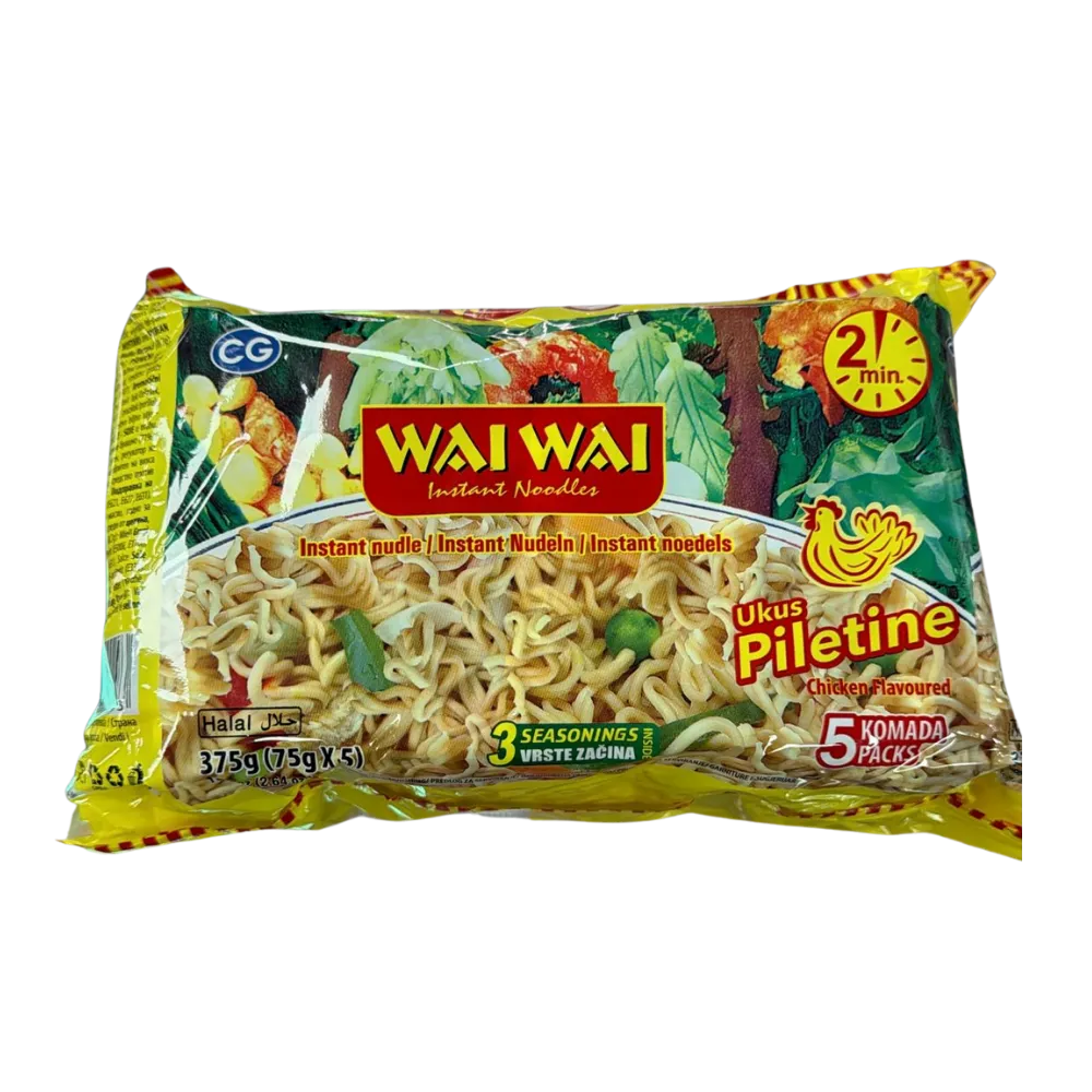 Wai Wai Instant Noodles Ukus Piletine brings you the comforting taste of chicken flavored noodles, perfect for a quick and satisfying meal. Each pack contains 5 servings, making it ideal for families or multiple meals.