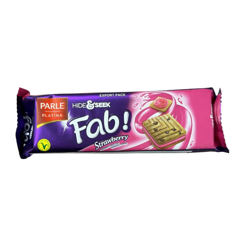 Enjoy the fruity twist of Parle Hide & Seek Fab! Strawberry. These delightful sandwich cookies feature a luscious strawberry flavored cream filling between crunchy chocolate biscuits. An export pack for superior quality.